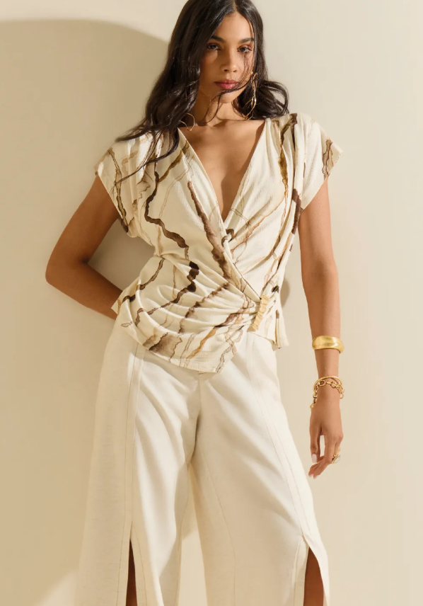 Essa blusa é confeccionada em viscose com elastano, tecido que oferece elasticidade e excelente durabilidade. A modelagem ajustada alia conforto ao toque de elegância, perfeita para combinações com calças ou saias. Disponível no padrão off white com estampa em tons terrosos que conferem estilo único e moderno.