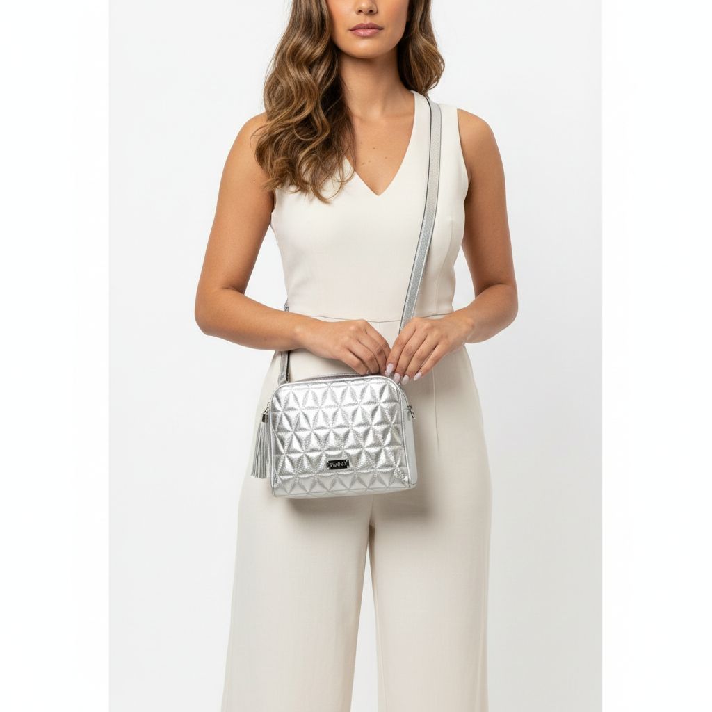 Bolsa compacta e moderna para quem busca praticidade e estilo. Ideal para usar no dia a dia com destaque para o acabamento em couro prata que dá um toque sofisticado.