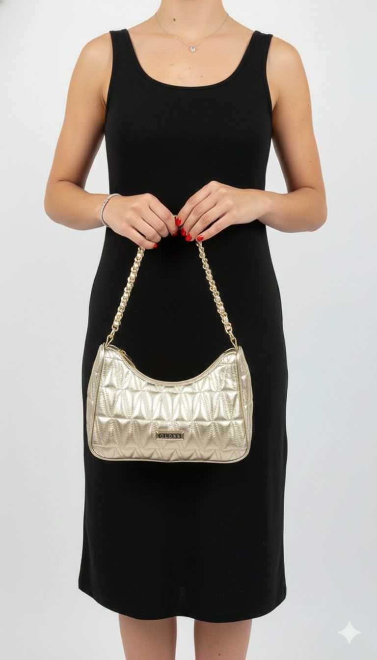 A Bolsa Dourada Couro Gloss oferece um design sofisticado com couro liso dourado e acabamento brilhoso. Seu tamanho compacto de 27cm de largura por 17cm de altura é ideal para carregar os essenciais do dia a dia com praticidade e estilo. Possui alça curta em correntes douradas que valorizam o visual, além da alça tiracolo em couro que proporciona conforto e versatilidade no uso. Perfeita para diferentes ocasiões, combina elegância e funcionalidade.