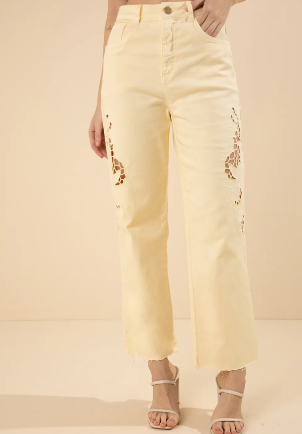 A Calça Morena Rosa Reta Média em tom amarelo é perfeita para mulheres que buscam estilo e conforto. Com design reto e cintura média, essa peça apresenta detalhes vazados que acrescentam um toque moderno e sofisticado ao visual. Fabricada com tecido de alta qualidade, oferece durabilidade e caimento impecável para uso diário ou ocasiões especiais. O acabamento em barra desfiada traz um ar despojado e contemporâneo, reforçando a versatilidade da calça.