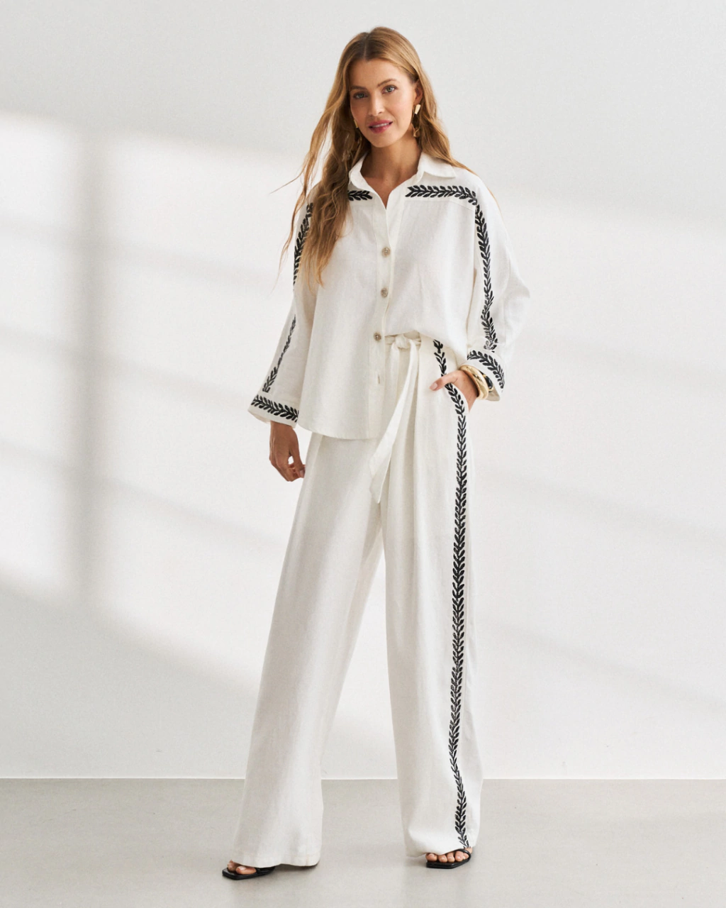 Confeccionada em tecido leve e fluido, essa calça oferece conforto e caimento amplo. A modelagem é ampla, com cintura ajustável para melhor ajuste. O destaque fica por conta da estampa artesanal exclusiva da Haes, que traz um desenho orgânico de folhas nas laterais que alonga a silhueta. Possui bolsos laterais para maior praticidade. Ideal para quem busca elegância e personalidade em uma peça versátil.