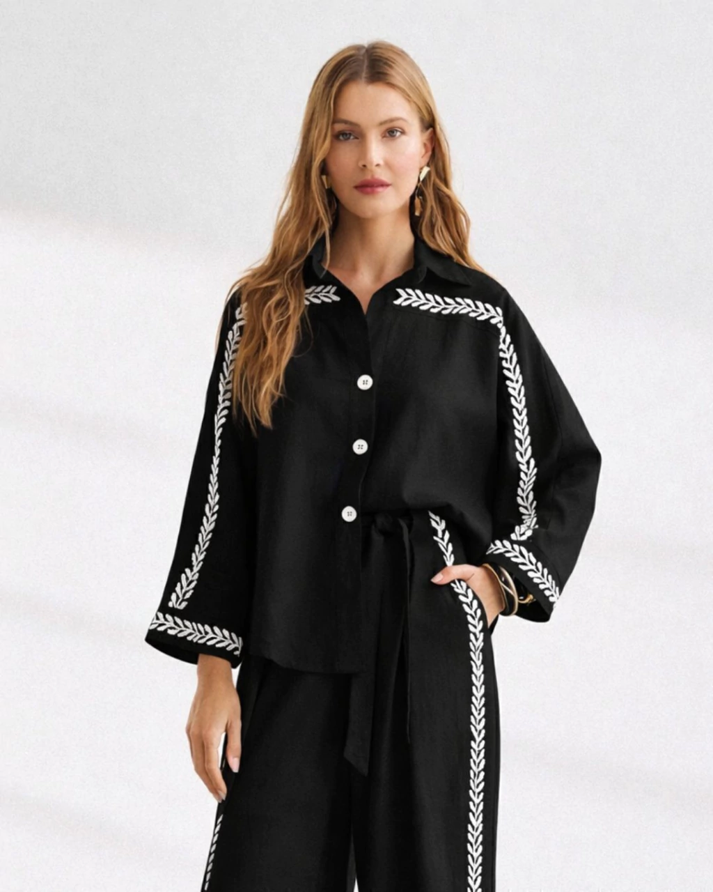 A camisa é confeccionada em tecido leve, promovendo conforto e ventilação. Sua modelagem solta e as mangas amplas criam um caimento moderno e elegante. A estampa folhas delicadas é feita manualmente, tornando cada peça única e especial. Ideal para quem busca um toque natural e autoral no visual.