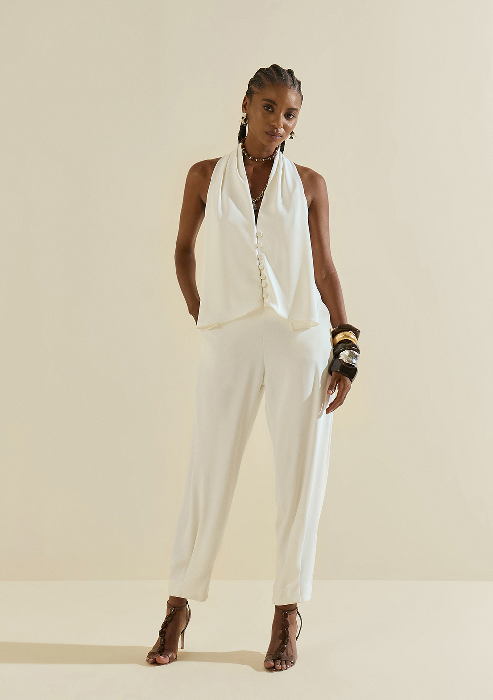 O Colete Morena Rosa Sem Manga Padrão Off White é desenvolvido em tecido crepe de alta qualidade, garantindo leveza e caimento suave. Sem mangas, sua modelagem valoriza a silhueta feminina com delicadeza, ideal para os dias mais quentes do ano. A peça traz detalhes sofisticados, como botões frontais revestidos no próprio tecido, reforçando o design elegante. Combine facilmente com calças cargo ou skinny para um visual versátil e moderno.