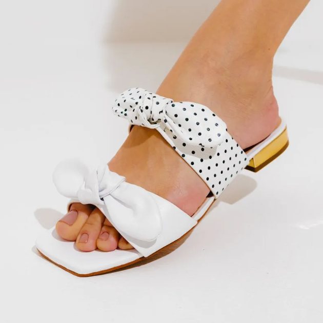 Rasteira Confeccionada em Couro, com Destaque para a Estampa Poa, Possui Tiras Largas Adornadas com Laços em Efeito Slouchy, Oferecendo Um Toque Sofisticado e Moderno. o Modelo Apresenta Bico Quadrado e Salto Bloco Baixo, Que Garantem Conforto e Estabilidade, Enquanto Mantém Um Estilo Elegante e Contemporâneo. Ideal para Adicionar Um Charme Refinado Ao Seu Look Diário.