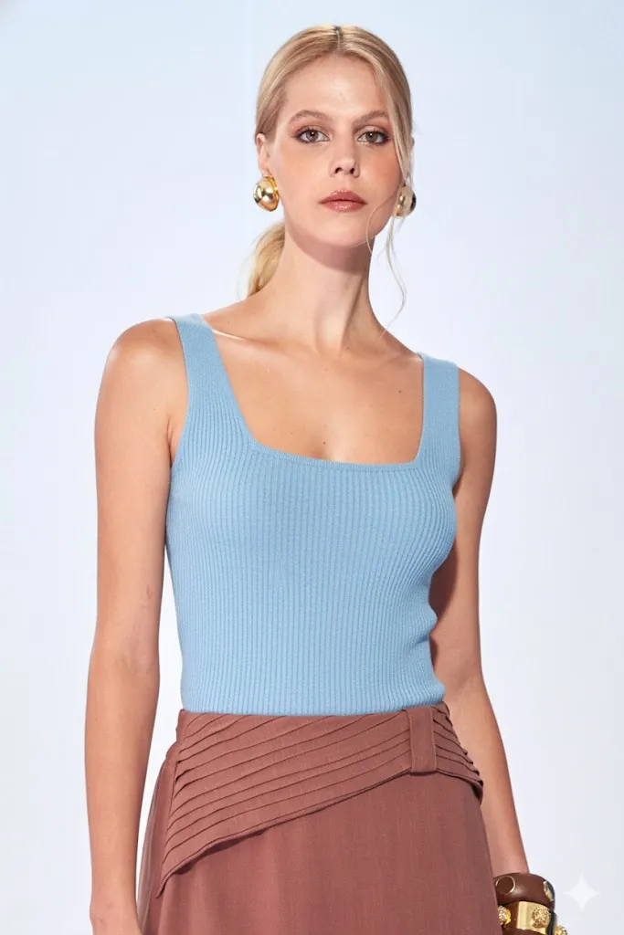 Confeccionada em tricô canelado com acrílico, viscose e elastano, essa regata azul oferece conforto e ajuste perfeito ao corpo.