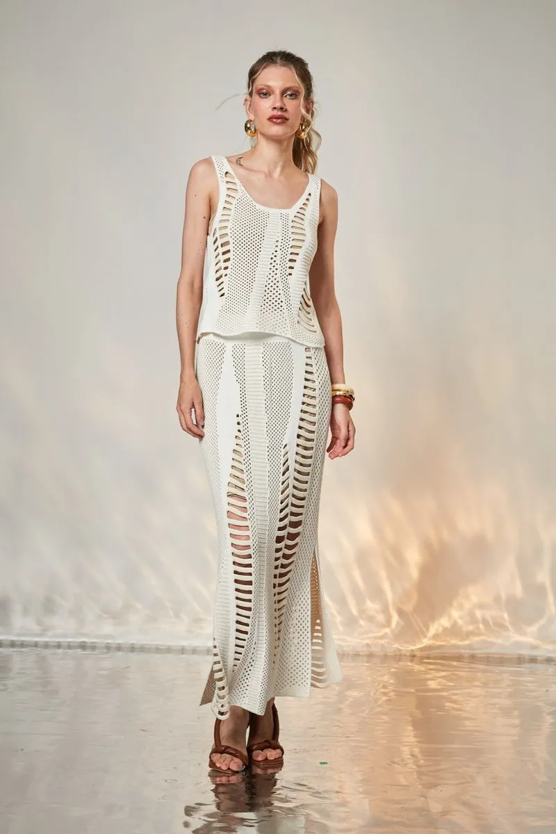 A Saia Maré Baixa é a escolha ideal para quem busca estilo e conforto em uma peça única. Feita em tricô com uma trama vazada diferenciada, ela possui elástico na cintura, garantindo ajuste perfeito. O charme extra fica por conta das fendas laterais, que trazem movimento e um toque sensual ao design. A saia conta ainda com forro, proporcionando cobertura ideal sem comprometer a leveza do tricô.