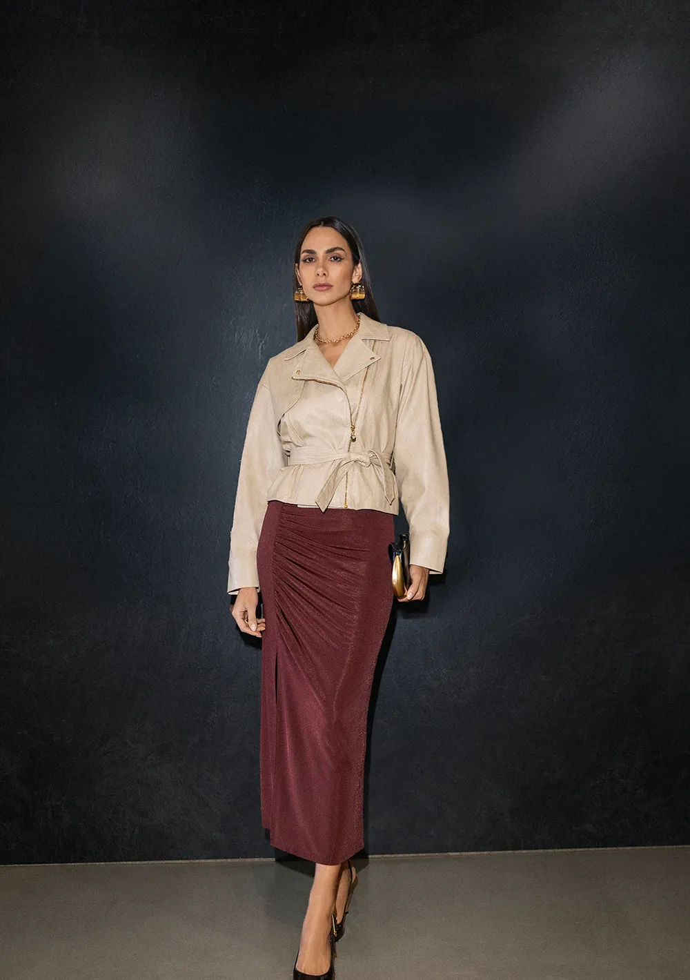 Confeccionada com material que combina resistência e elasticidade, essa saia é fácil de vestir e adequada para usos que vão do casual ao social. Seu comprimento midi está alinhado com as tendências atuais, favorecendo o uso em várias estações do ano, especialmente com blusas justas ou jaquetas.