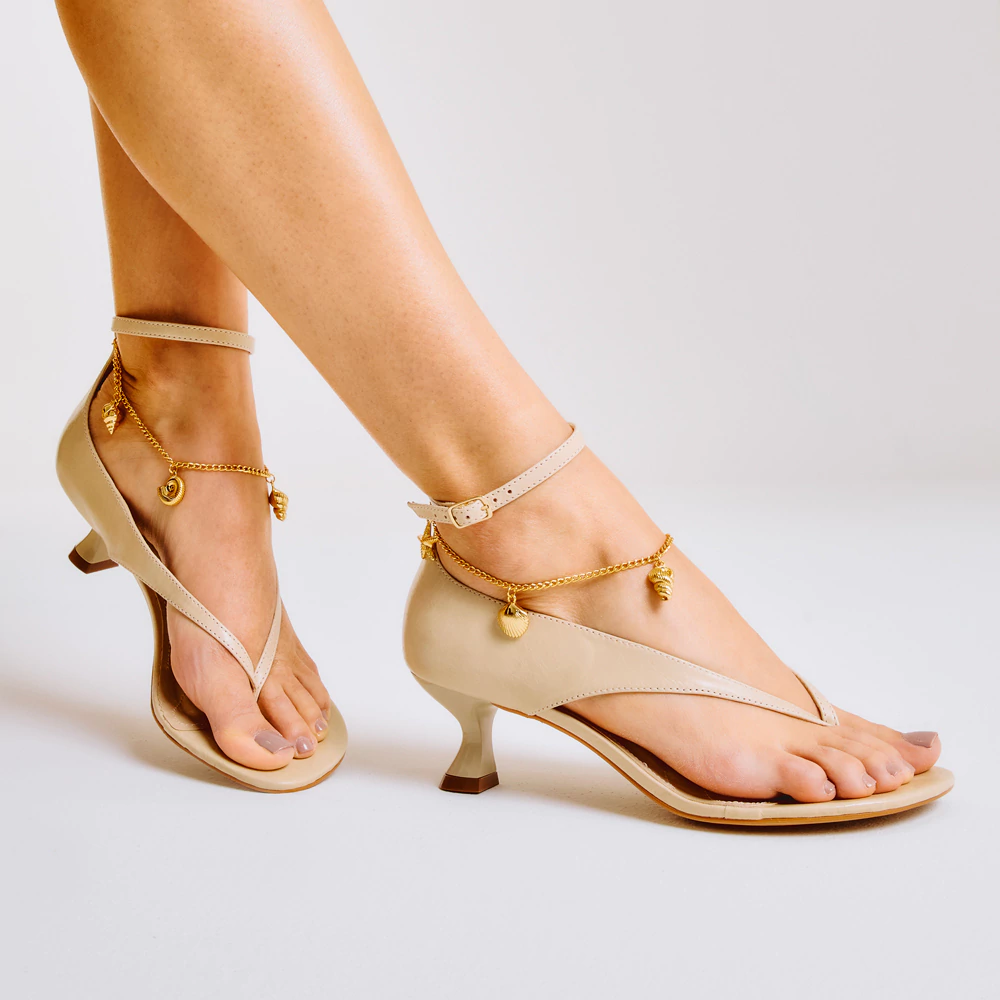 Apresentamos a Sandália Cecconello em couro na cor Off-white, ideal para quem busca conforto e estilo. Com salto baixo escultural, proporciona estabilidade ao caminhar, enquanto as tiras finas valorizam os pés com delicadeza. A corrente dourada com pingentes exclusivos de estrela-do-mar e conchas adiciona um toque sofisticado e litorâneo ao visual. A palmilha macia e o couro legítimo garantem durabilidade e conforto durante todo o uso. Excelente escolha para produções modernas e elegantes.