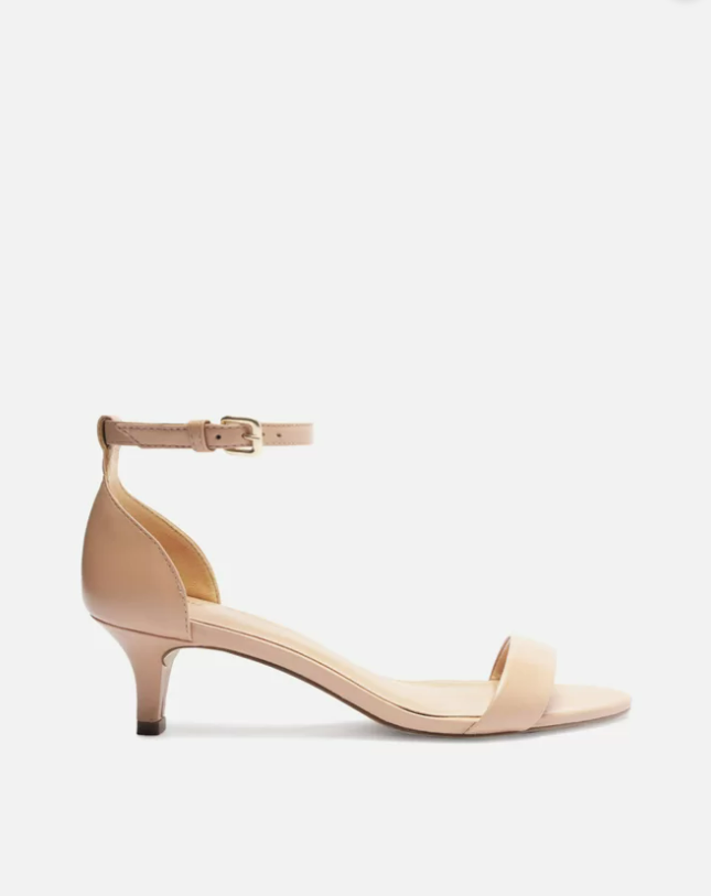 Sandália nude de couro. O modelo tem salto baixo fino e bico redondo. Traz tira média sobre os dedos. Fechada no calcanhar, possui tira fina em torno do tornozelo com fivela metálica lateral. A sandália exibe todo o peito do pé e os dedos.