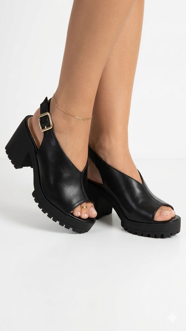 A sandália tem salto grosso de 8 cm que equilibra altura e conforto. O solado tratorado assegura firmeza ao caminhar e o ajuste com fivela no calcanhar garante boa fixação. Ideal para quem busca um modelo versátil para usar tanto durante o dia quanto à noite.