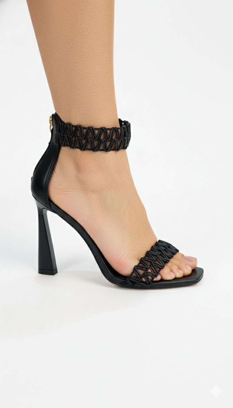 A sandália tem bico quadrado e palmilha acolchoada para conforto durante o uso. Preto clássico que combina com diversos looks e mantém o visual moderno. Indicado para festas, eventos ou momentos em que o salto alto realça a produção.