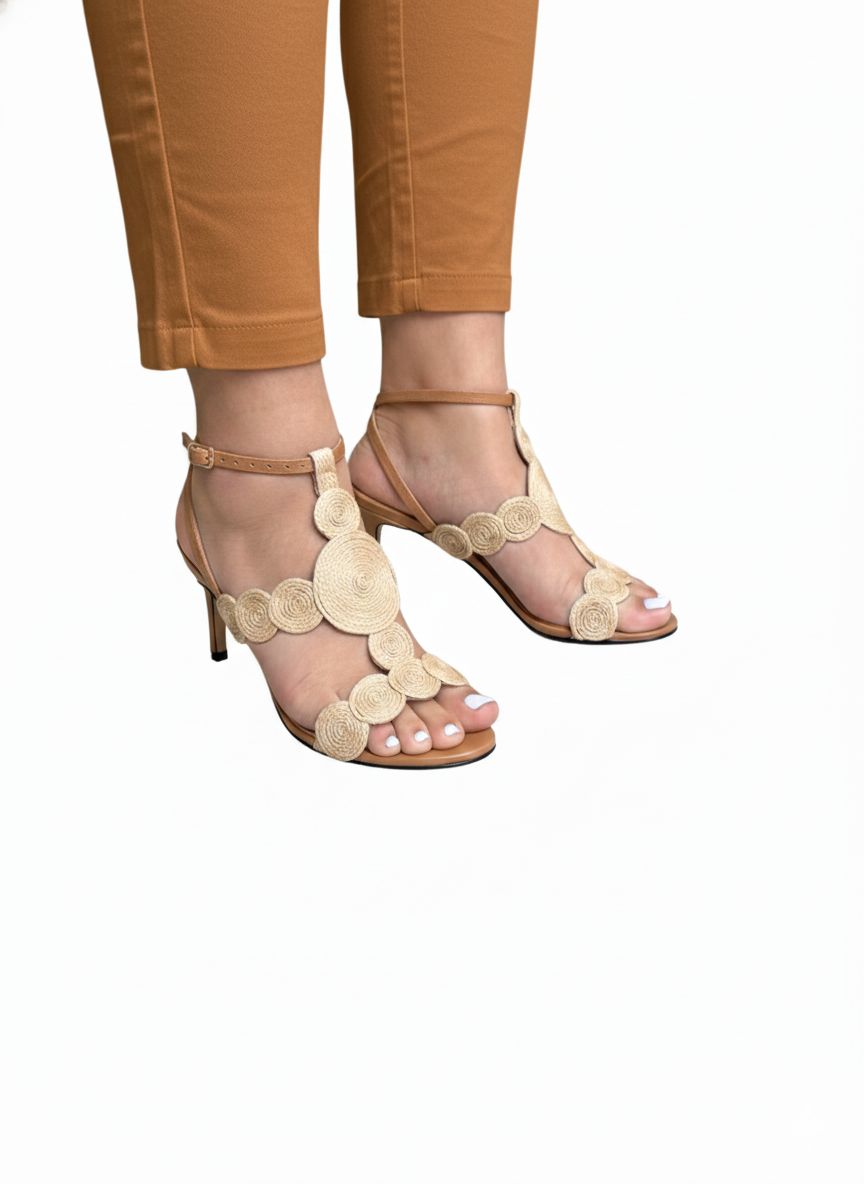 A Sandália salto fino de couro Lacore oferece elegância e conforto para ocasiões especiais. Seu design sofisticado em tom bege é realçado por detalhes circulares em material trançado que compõem a parte superior do calçado. Essa sandália combina facilmente com vestidos, saias e calças de alfaiataria. É uma excelente escolha para quem busca estilo e praticidade em um só produto.