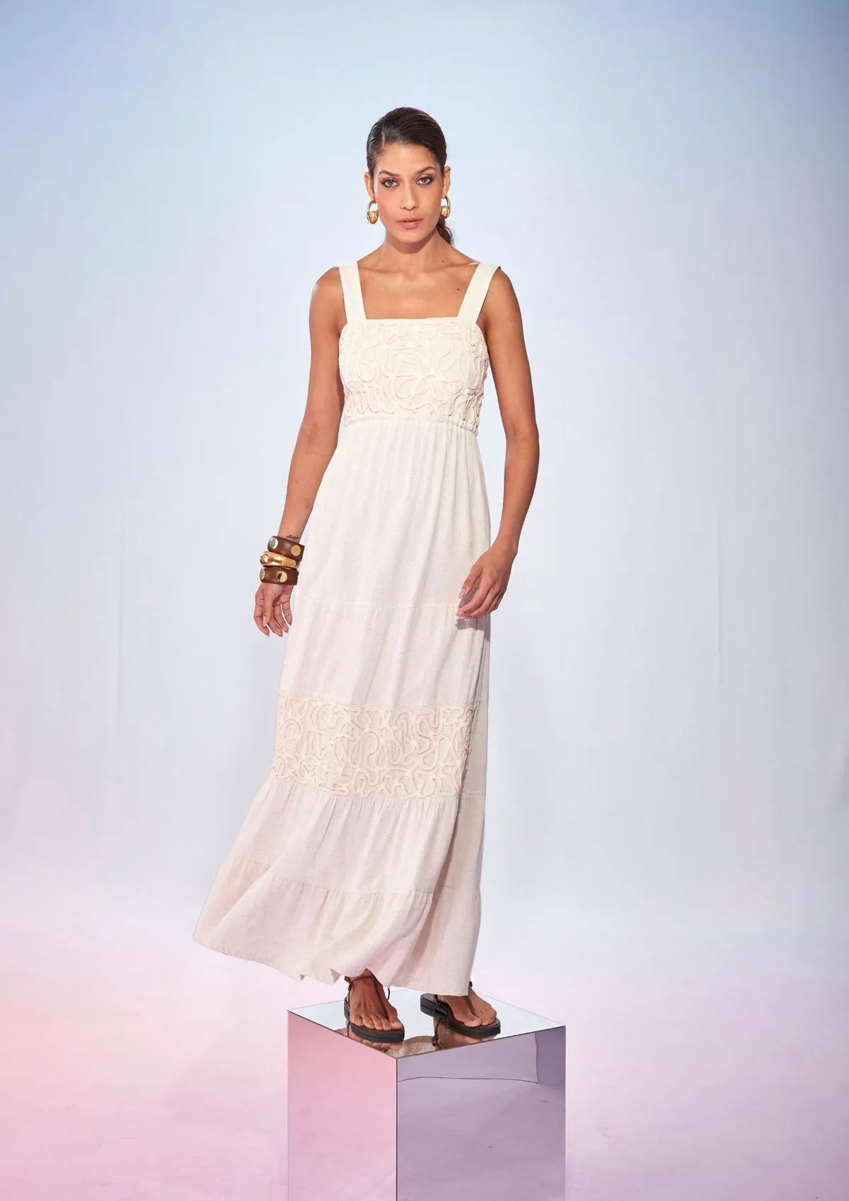 Vestido longo feito em viscose com linho, garante leveza e toque natural para uso confortável.