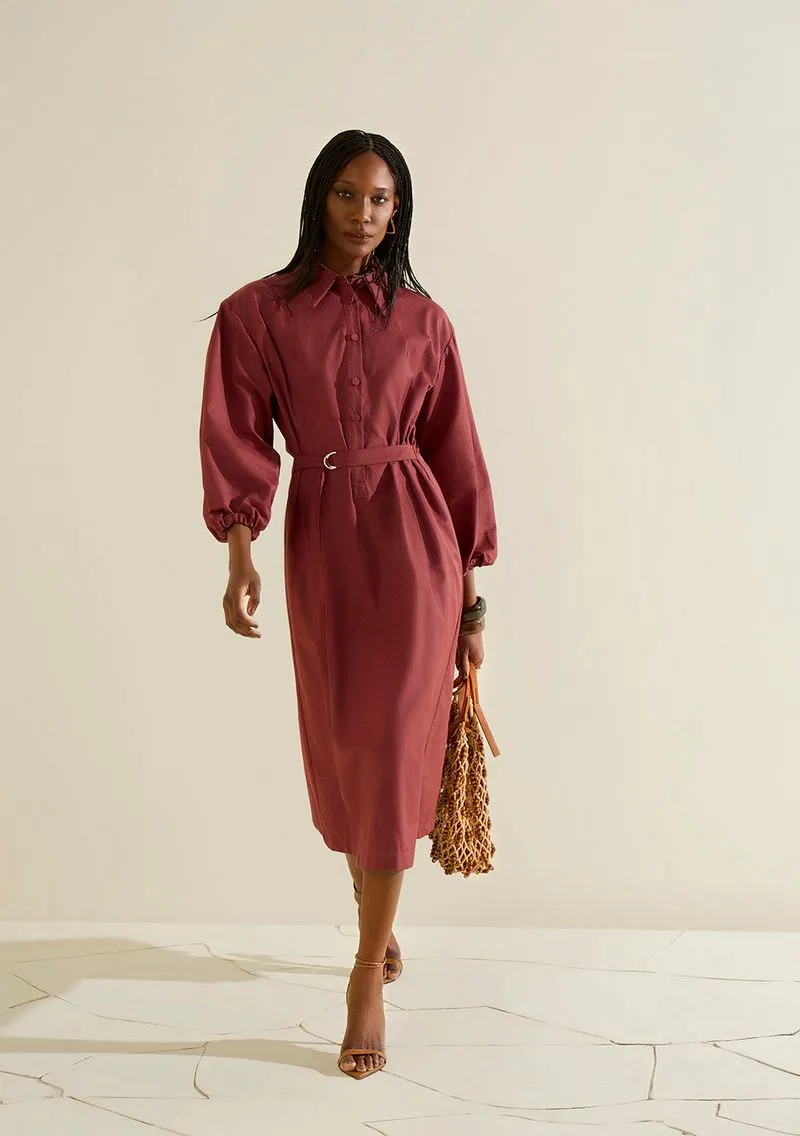 Feito com tecido que mistura algodão e poliamida, o vestido oferece frescor e resistência. A modelagem midi é ideal para diversas ocasiões, do dia a dia a eventos mais sofisticados. O comprimento e as mangas longas trazem elegância, enquanto o cinto possibilita ajuste funcional e estiloso.