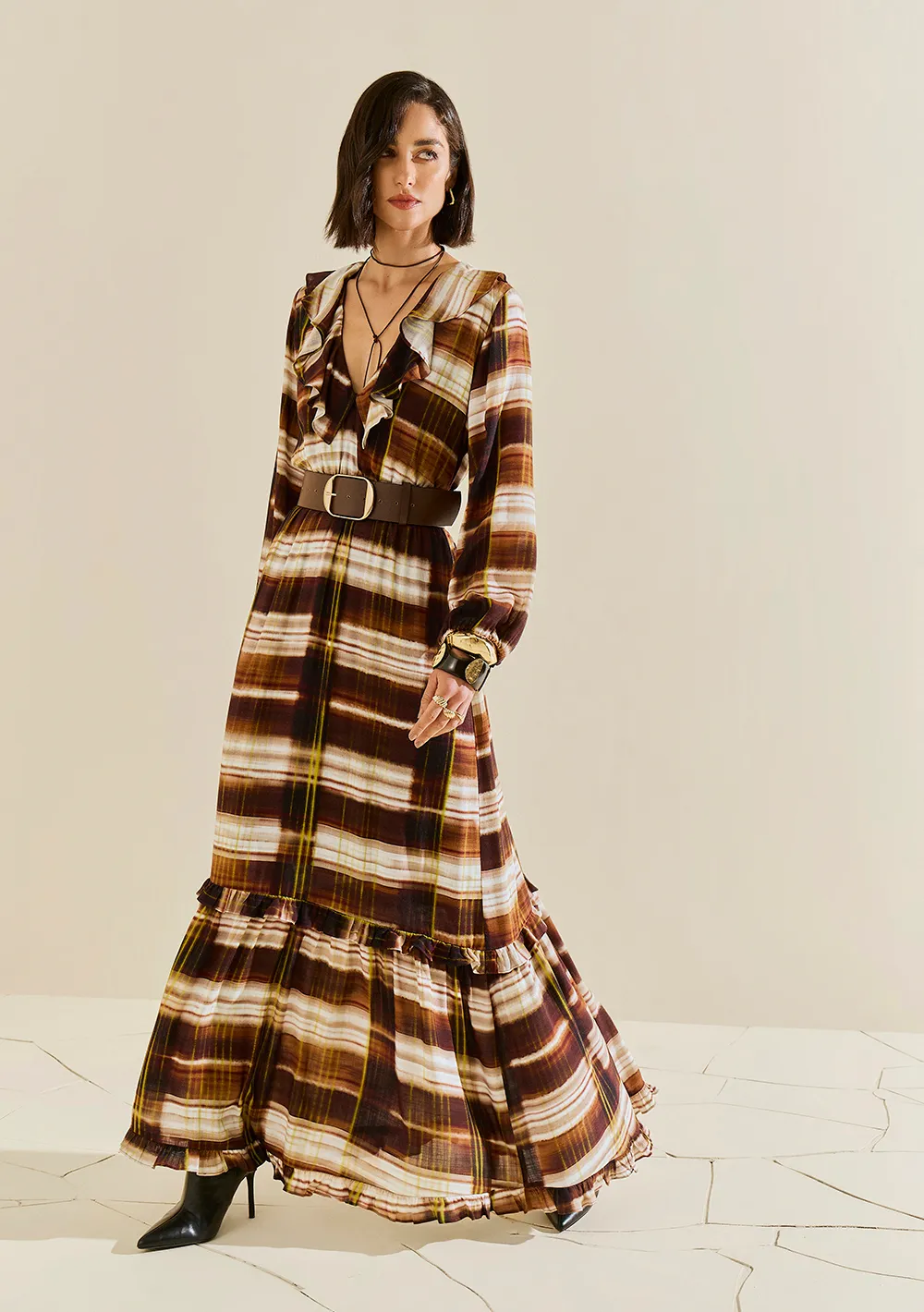 O vestido é feito em viscose, um material macio e refrescante, perfeito para usar em dias mais amenos ou noites com clima agradável. Seu comprimento longo traz elegância sem perder o conforto de uma peça solta e leve.